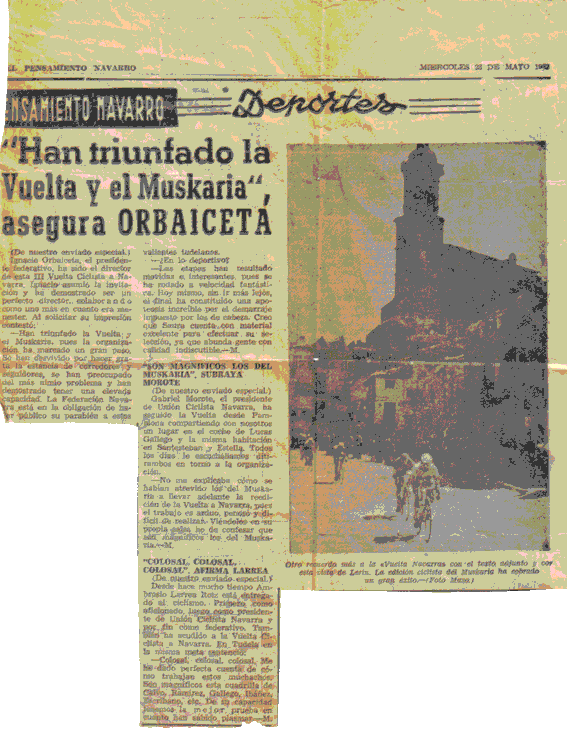 Desde el año 1962 y hasta 1970, el C.C. Muskaria, organizó La Vuelta a Navarra, contando los tres últimos, con la colaboración del C.C. Amaya. A partir de 1971, el Club, quedose solo con la sección de Cicloturismo, y promovió las Escuelas de Ciclismo en el año 1976, teniendo que dejar dichas escuelas unos años después, pero continuando con la sección de cicloturismo. |